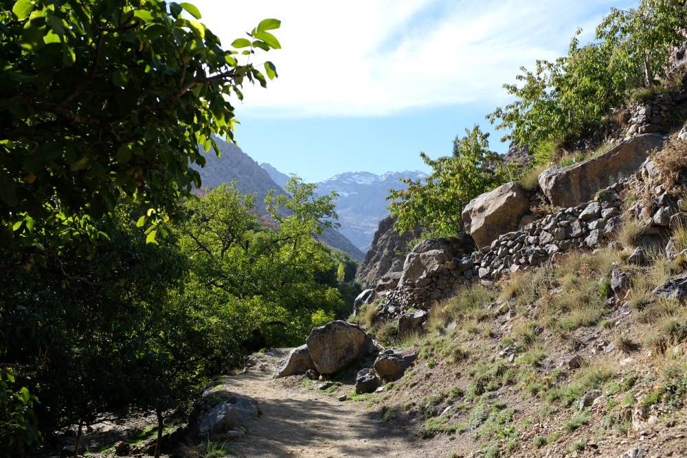 Our route was a linear one from central Imlil to the tiny hamlet of Sidi Chamarouch (31°05’50.87″N, 07°54’46.72″W), located just inside Toubkal National Park and on the way to Jebel Toubkal, North Africa’s highest mountain. The weather was perfect – cool and bright and with just a slight breeze. We couldn’t go much higher due to lack of specialist equipment – crampons and ice axes would be needed for much higher and our extended travel plans allowed for no such luggage. Rental options are available, but Mayumi’s first time hiking on snow probably shouldn’t be now.