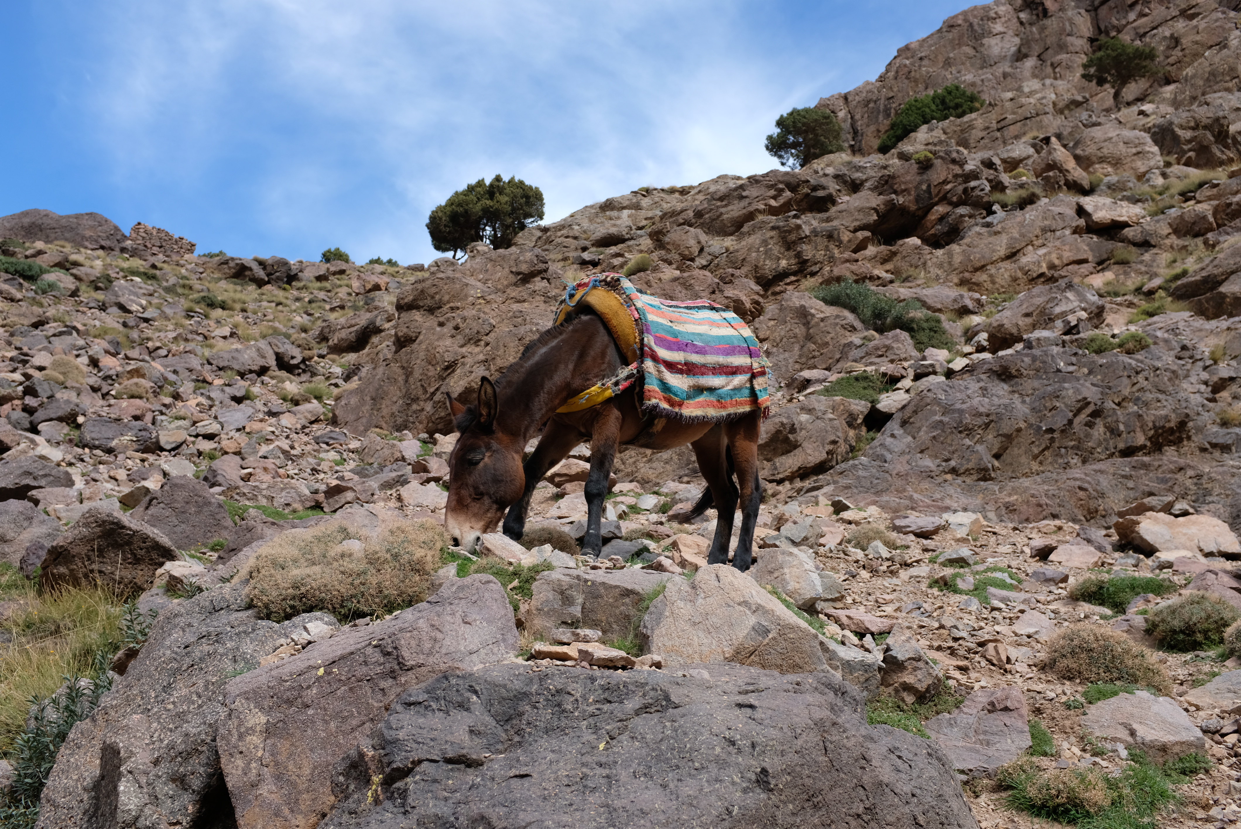 Leaving civilisation behind, again, we began a long walk up a wide bottomed valley. It was gorgeous. We weren’t alone either, having mule groups pass us in both directions and even a peanut brittle salesman getting some business out of me. Still relatively flat, climbing only in short bursts, we enjoyed the gorgeous weather of clear skies, fifteen degrees and just a light breeze. Perfection. This was my kind of Morocco.