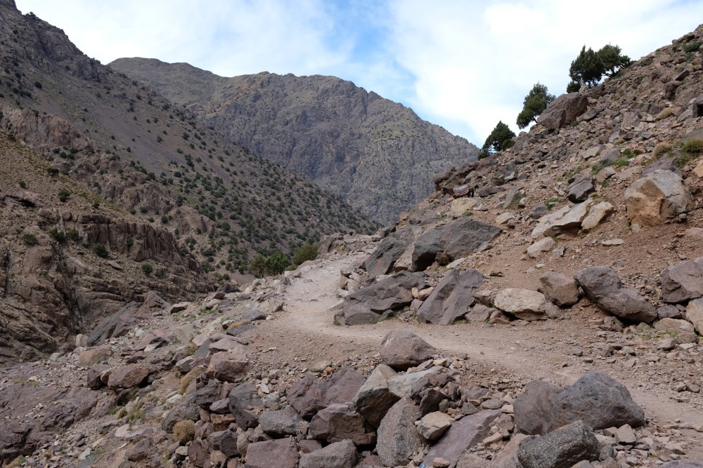 Our navigation, and I am ashamed of this, was via iPhone – an app named maps.me – using free source mapping; its surprising accuracy helped with finding our route when other alternative paths cross-crossed the area. That combined without realtime GPS locator made the whole thing almost too easy. Should I have had a real map? Yes, absolutely. And I’m stupid for not. But I tried to buy one the previous day and a young gentleman wanted £15 for a laminated foldout which in the UK would be less than £2. I knew that, in the worst case scenario, I could pay somebody less than that to throw me and my partner onto a mule and carry us down the mountain. And, having said that, using the iPhone was a good choice as there’s only one major path which climbs Jebel Toubkal from Imlil, so the iPhone works more like a clock than a map, keeping tabs on how far away lunch is. A four year old could navigate this hike.