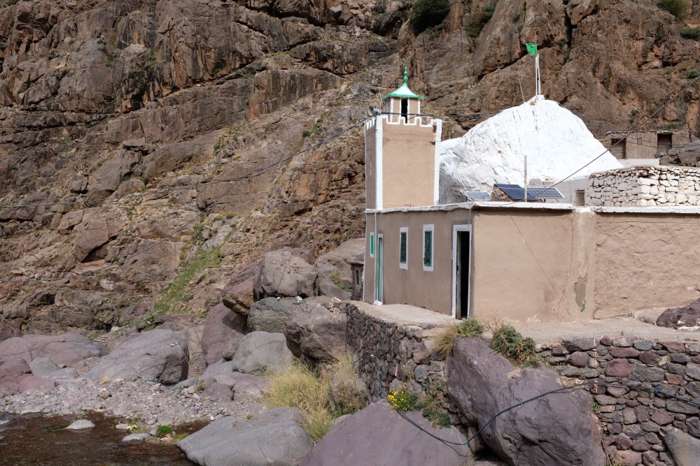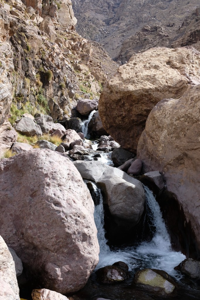 Around lunchtime we were arriving at our destination, Chamarouch. It’s not really a town as such, more of a pitstop for those continuing up the mountain and onto the summit of Jebel Toubkal. Just over halfway to the overnight refuge, it’s the perfect spot for picking up a wooly hat (the temperature is dropping), a can of coke and a cheeky tagine – or in our case, a tin of tuna to match the breakfast’s left over bread.